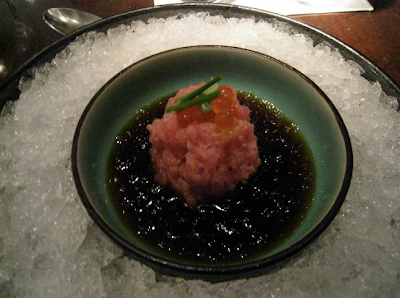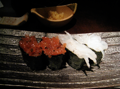 I liked the combination of Tuna and Foie Gras so much that I decided to order some more of it, this time in a sushi form. from left to right: Tuna and Foie Gras sushi x2, Salmon roe, and Octopus. the Tuna and Foie Gras sushi is probably one of the best mouthfuls of food I've ever had!
